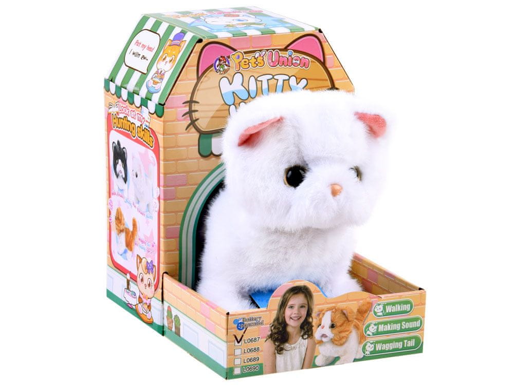 Majhna mucka je napolnjena s plišasto kožo, ima plastične oči, nos. Maček hodi naprej, premika glavo, rep in pri oddajanju zvoka premika smrček. Čudovit maskota, za katerega se odlično skrbi. Plišasta mucka lahko postane najboljši prijatelj otroka. Skoraj vsak otrok ima obdobje, ko čuti veliko potrebo po pravem domačem ljubljenčku. Težko je izpolniti vse otroške želje, še posebej, ko sanjajo o pravem hišnem ljubljenčku, mi pa nimamo možnosti, da bi ga imeli. Zato, da bi vsaj na pol in vsaj delno izpolnili njihove želje, vam ponujamo to čudovito plišasto mačko. Prisrčna plišasta mucka bo razveselila vsakega oboževalca ljubljenih hišnih ljubljenčkov.Dimenzije igrače: