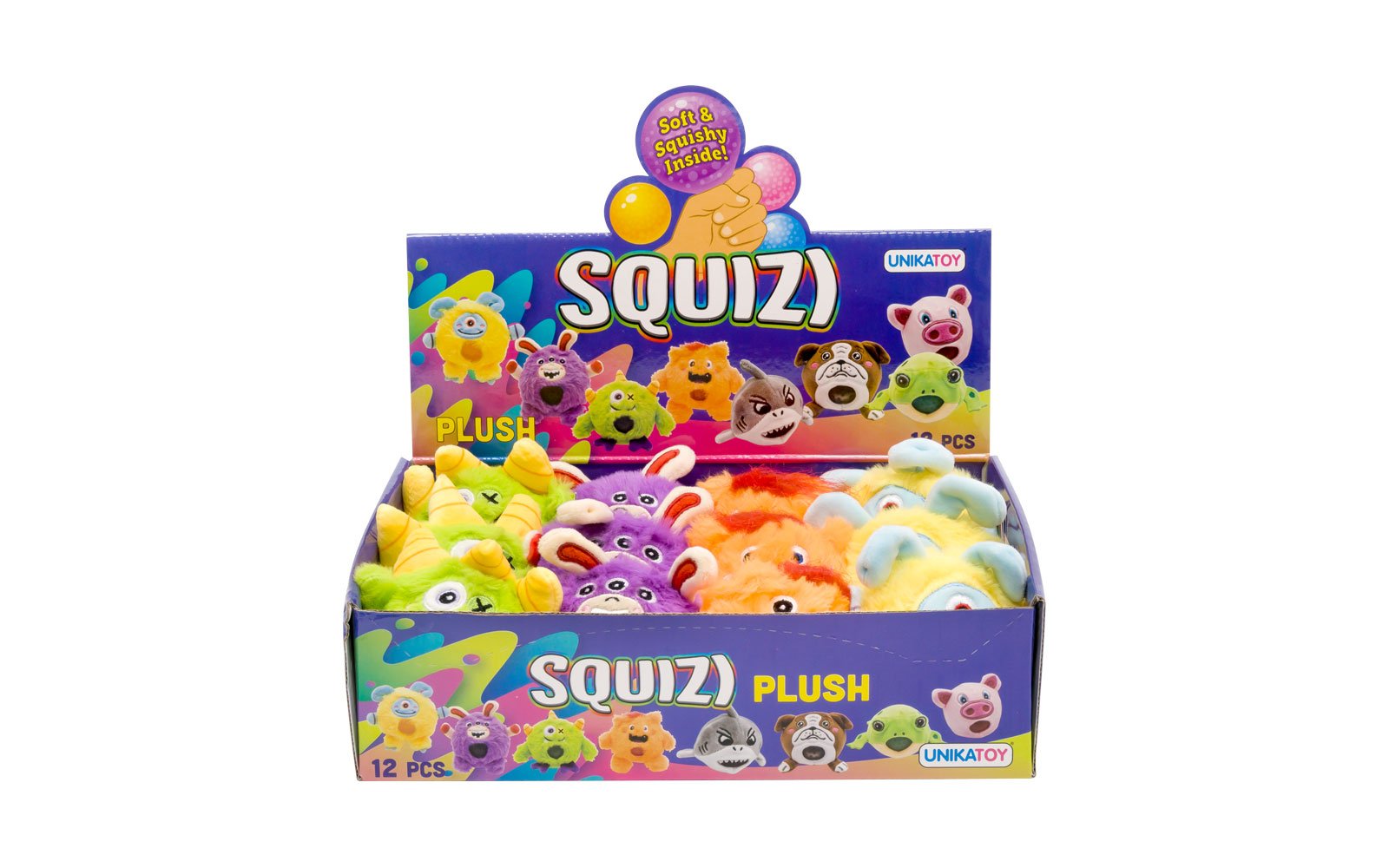 Plišasta pošast Monster Squizi, Unikatoy s strašljivim pogledom in kroglicami znotraj trebuščka. Figurica je iz mehkega materiala, trebušček pa je raztegljiv. Na voljo v različnih barvah in stilih: zelena, vijolična, oranžna ali rumena.