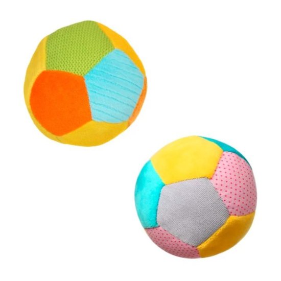 Pestre, kontrastne barve, razporejene v geometrijske peterokotnike, osredotočajo otrokov vid in pomagajo razlikovati barve. Nežen zvok zvončka v notranjosti igrače spodbuja igro. Mehkoba žogice spodbuja, da jo prijema in premika iz ene roke v drugo.