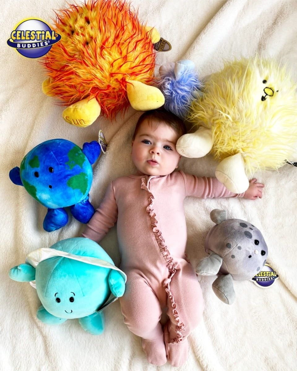 Plišasti planet – Zemlja, plišasti planet – Luna, plišasti planet – Mars, plišasti planet – Saturn, plišasti planet – Jupiter, plišasti planet – Uran, plišasti planet – Venera, plišasti planet – Neptun, plišasti planet – Merkur, plišasti komet, plišasta zvezda – Sonce, plišasti planeti – Pluton in Luna Haron, črna luknja