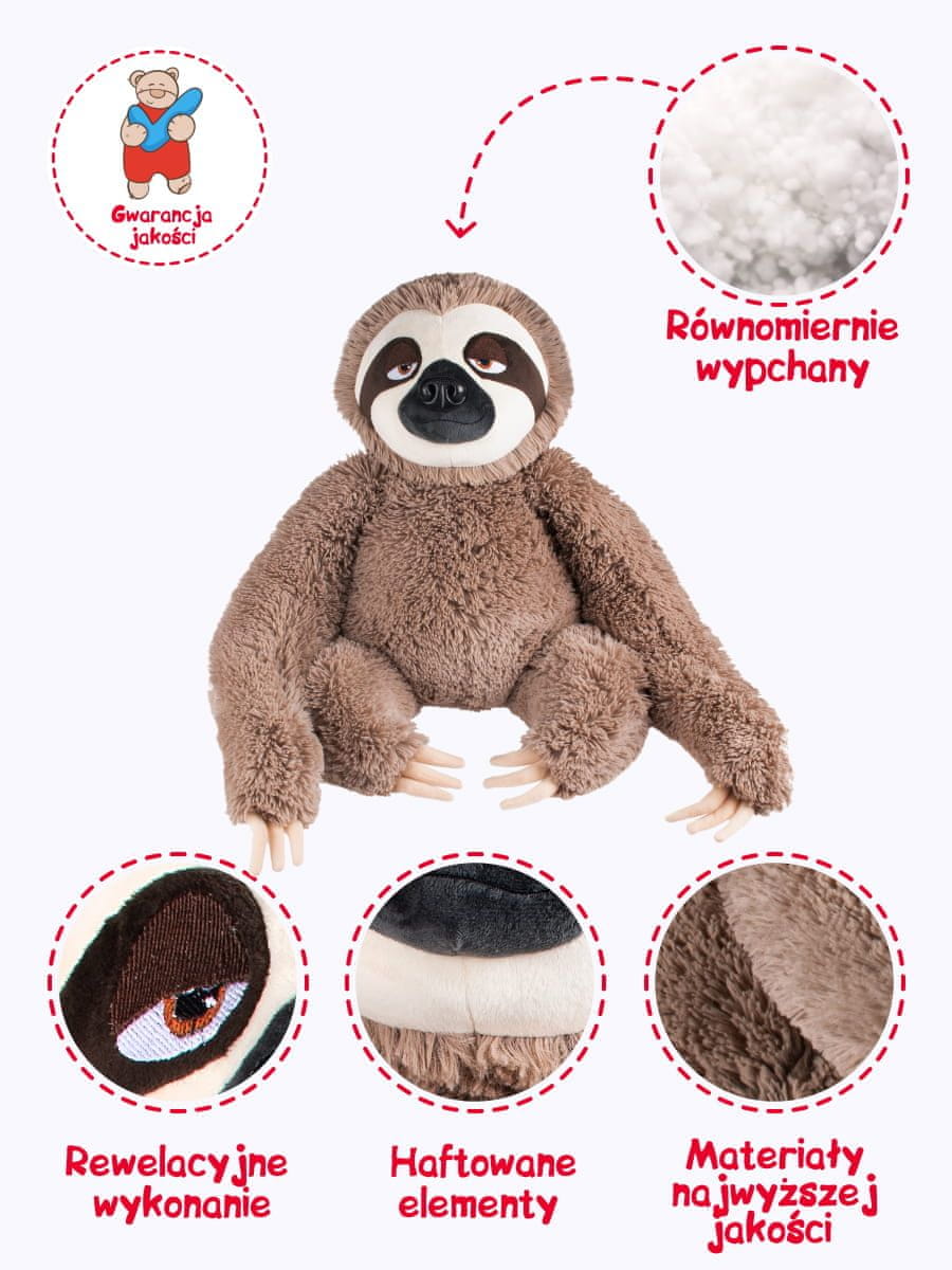 • Zanimiva plišasta igrača, ki prikazuje lenivca z nasmejanim obrazom in očmi, ki so skrbno izvezene z nitjo, kar igrači daje značaj in edinstven videz