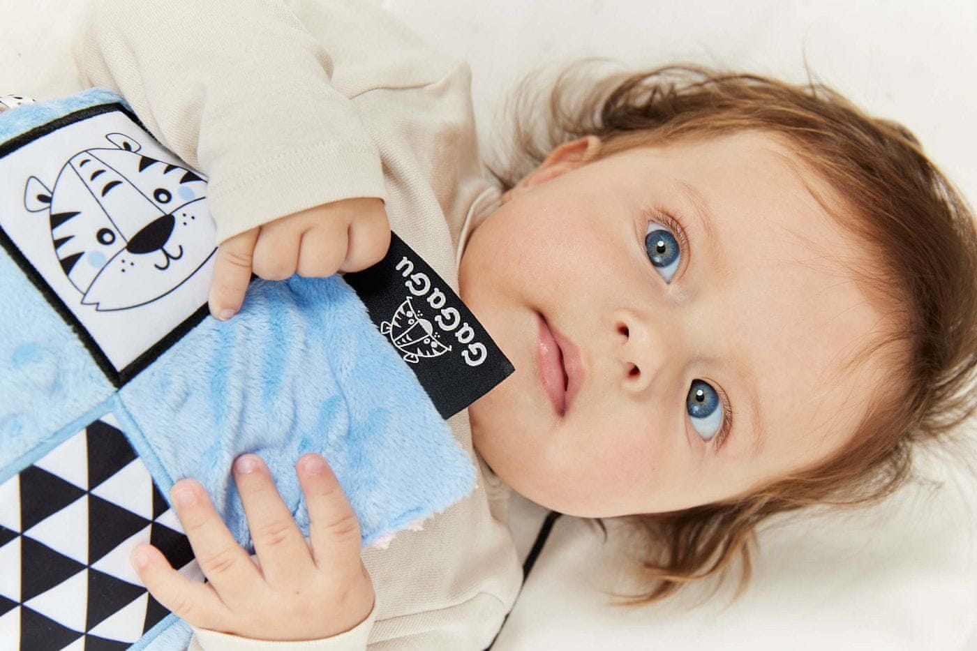 Pravi genij je oseba z vsestranskimi talenti in interesi. Zato je treba že od prvih dni življenja skrbeti za vsestranski razvoj. Pri tem je lahko v pomoč obojestranska rustikalna odeja s sliko tigra na eni strani in ovce na drugi. Igrača je namenjena otrokom, starim 0 m+. odeja ima kontrastne barve in vzorce, ki spodbujajo otrokov vid, šumeči material v notranjosti igrače pa spodbuja njegov sluh. Otrok ima priložnost raziskovati različne teksture, kar mu omogoča razvijanje občutka za dotik. Dodatni trakovi, plišaste zanke, velika etiketa – otroku olajšajo prijem igrače in spodbujajo tako imenovano urjenje fine motorike (gibanje prstov in rok). Odejica je obojestranska – na vsaki strani je drugačna grafika: na eni strani ovčka – na drugi tiger. Igrača je zelo lahka in priročna, enostavno jo je shraniti, idealna za sprehod ali izlet. Starost 0+