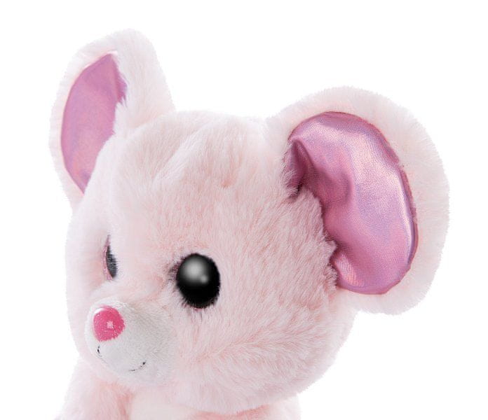 Roza miška z rožnatim bleščečim nosom in bleščečimi očmi. Celoten opis