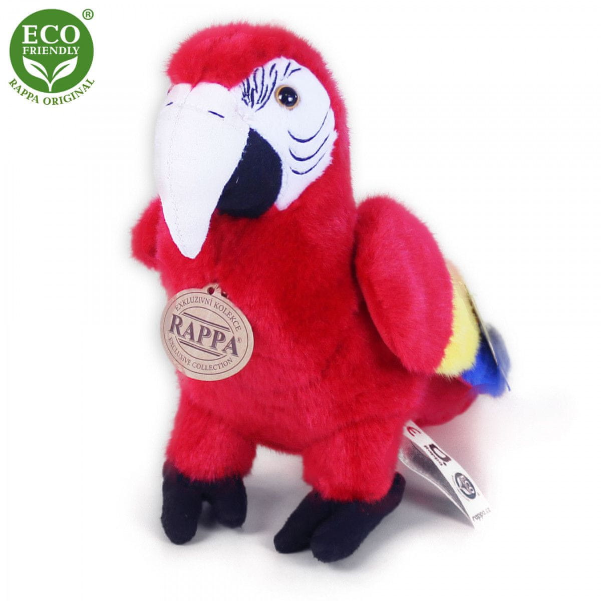 Rdeča plišata ptica papiga makak meri 24 cm in zaradi najkakovostnejših materialov spada v Rappovo ekskluzivno zbirko plišastih igrač. Poleg tega je zaradi ročno izdelane obrti vsak kos videti kot živopisan. Zakaj oznaka ECO-FRIENDLY? Podjetje Rappa se zaveda vseh vplivov na okolje, zato se osredotoča na trajnost in čim manjšo uporabo plastike. Zato je polnilo igrač narejeno iz recikliranih materialov, zlasti steklenic PET. Vendar je slednja popolnoma neškodljiva in primerna za otroke od rojstva dalje. Zabaven podatek: Ali ste vedeli, da so papige makaki zelo inteligentne in da znajo posnemati človeški govor?