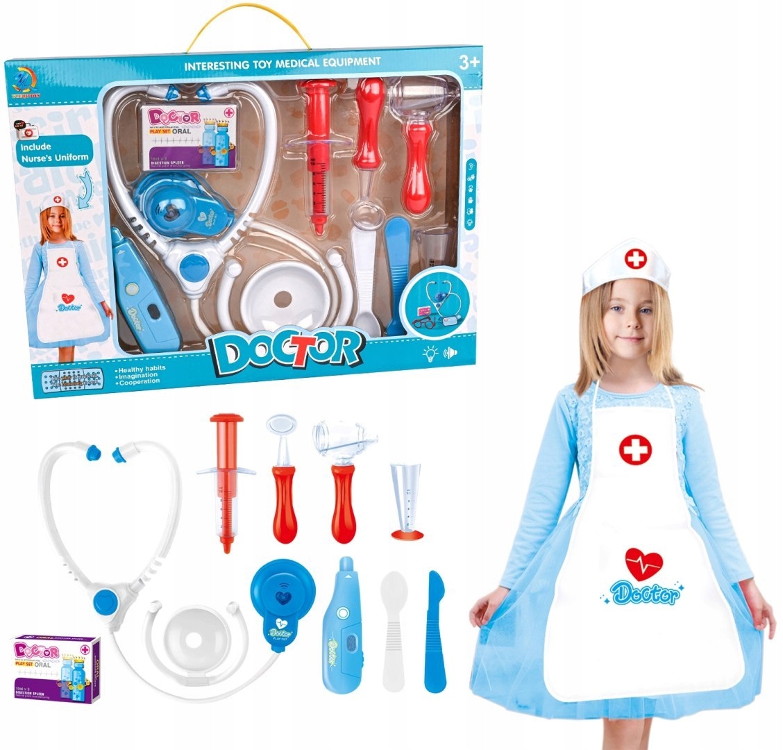 Poleg osnovnih medicinskih orodij komplet vključuje tudi moder predpasnik za vašega malega zdravnika.