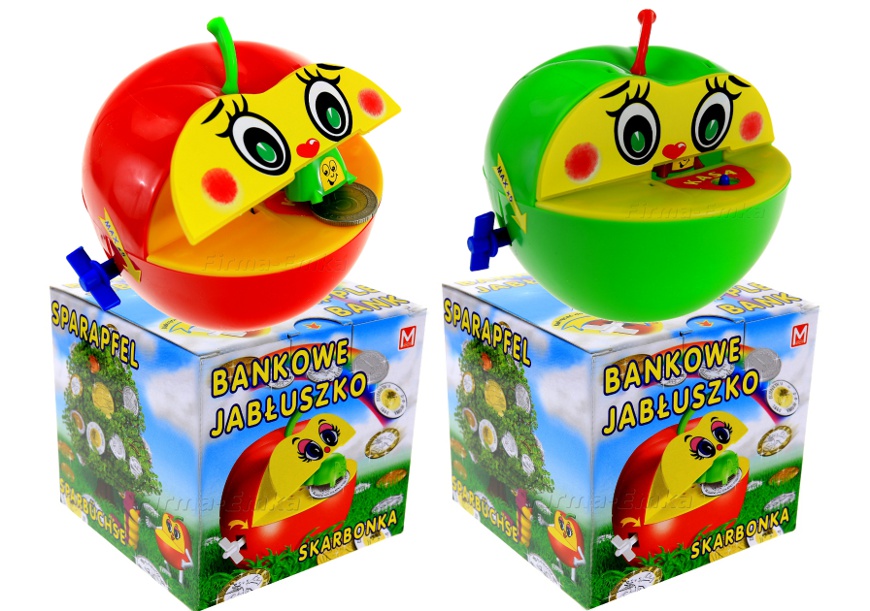 Hranilnik s samodejnim pobiranjem kovancev. Samo položite kovanec v prostor z oznako GOTOVINA in rahlo pritisnite, nasmejani črv se bo nagnil iz jabolka in kovanec odnesel do jabolka.