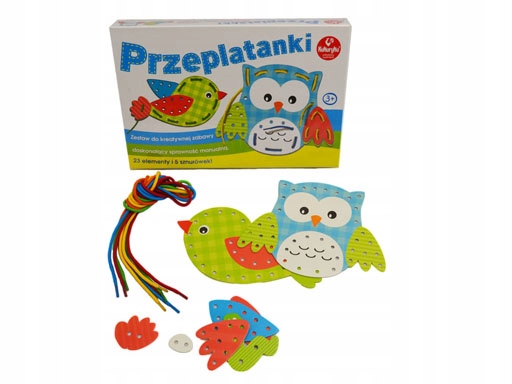 Komplet za kreativno igro, ki izboljšuje ročno spretnost malčkov. Otroci lahko prosto kombinirajo posamezne elemente kompleta ali pa posamezne kose pobarvajo z nitjo in prepletanjem pisanih vezalk.