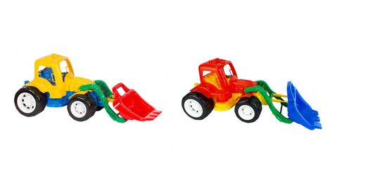 • Velik traktor z pisano kabino in širokimi (plastičnimi) kolesi ter ogromno žlico je odličen za gradnjo peščenih gradov ali druga težka gradbena dela.