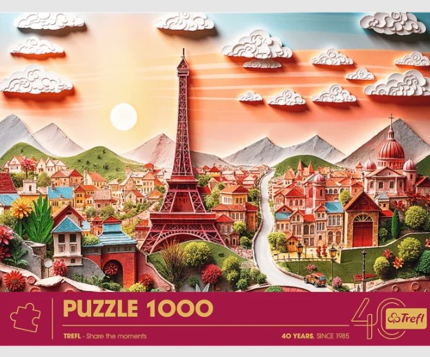 1000-delna sestavljanka s 3D učinkom 40. obletnica Trefl – Pariz je del serije sestavljank, ki navdušujejo z imitacijo 3D-učinka, izdane ob obletnici našega podjetja. Praznujte z nami tako, da sestavite edinstvene slike, navdihnjene z umetnostjo papirnate umetnosti !