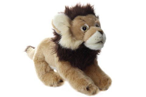 Plišasti lev velikosti približno 28 × 23 × 12 cm (brez repa). Celoten opis