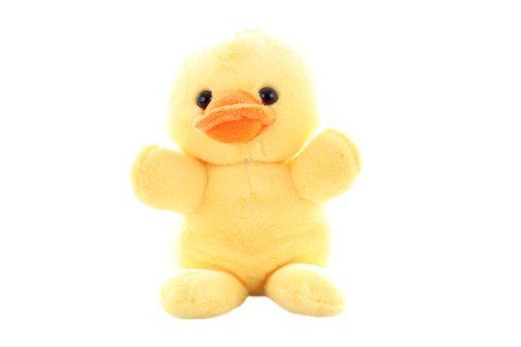 Plišasta račka. Dimenzije z nogami 15×21×11 cm. Celoten opis