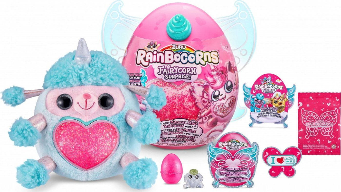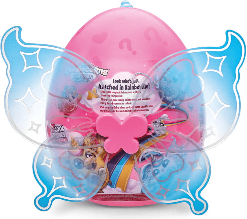 Jajce s krili in številnimi čarobnimi presenečenji! Odvijete svoje neverjetno čarobno pravljično presenečenje in se podate v svet vil z Rainbocornyjem! Vsaka vila ima svoja čarobna krila in za ljubitelje teh prikupnih plišastih vilec imamo presenečenje! V paketu so vključena krila vile, ki čakajo samo na vas! Krila imajo nastavljive elastične trakove, ki zagotavljajo udobno prileganje. V notranjosti jajca je eden od šestih novih prikupnih enorogov, ki ima svoja krila. Očarali vas bodo tudi čudovito bleščeče srce, ki je na prsih Rainbocorna, čarobna pena za oblikovanje, nalepke ali prikupni Boo-Boocorn! Kateri od teh šestih prikupnih samorogov vas čaka? Vsebina paketa.