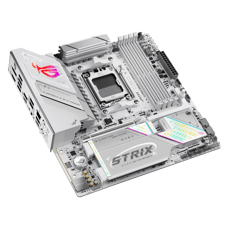 Matična plošča ROG Strix B850-G Gaming WiFi prinaša zmogljivost naslednje generacije v kompaktnem Micro-ATX formatu. Z osupljivim belim tiskanim vezjem (PCB) in srebrnimi hladilniki je idealna osnova za estetsko dovršene računalniške sisteme. Zasnovana je za najnovejše procesorje AMD Ryzen™ serije 9000 (ter 8000 in 7000), ki jih napaja robustna napajalna rešitev s 14+2+1 (80A) napajalnimi stopnjami, kar zagotavlja stabilno delovanje tudi pri največjih obremenitvah.