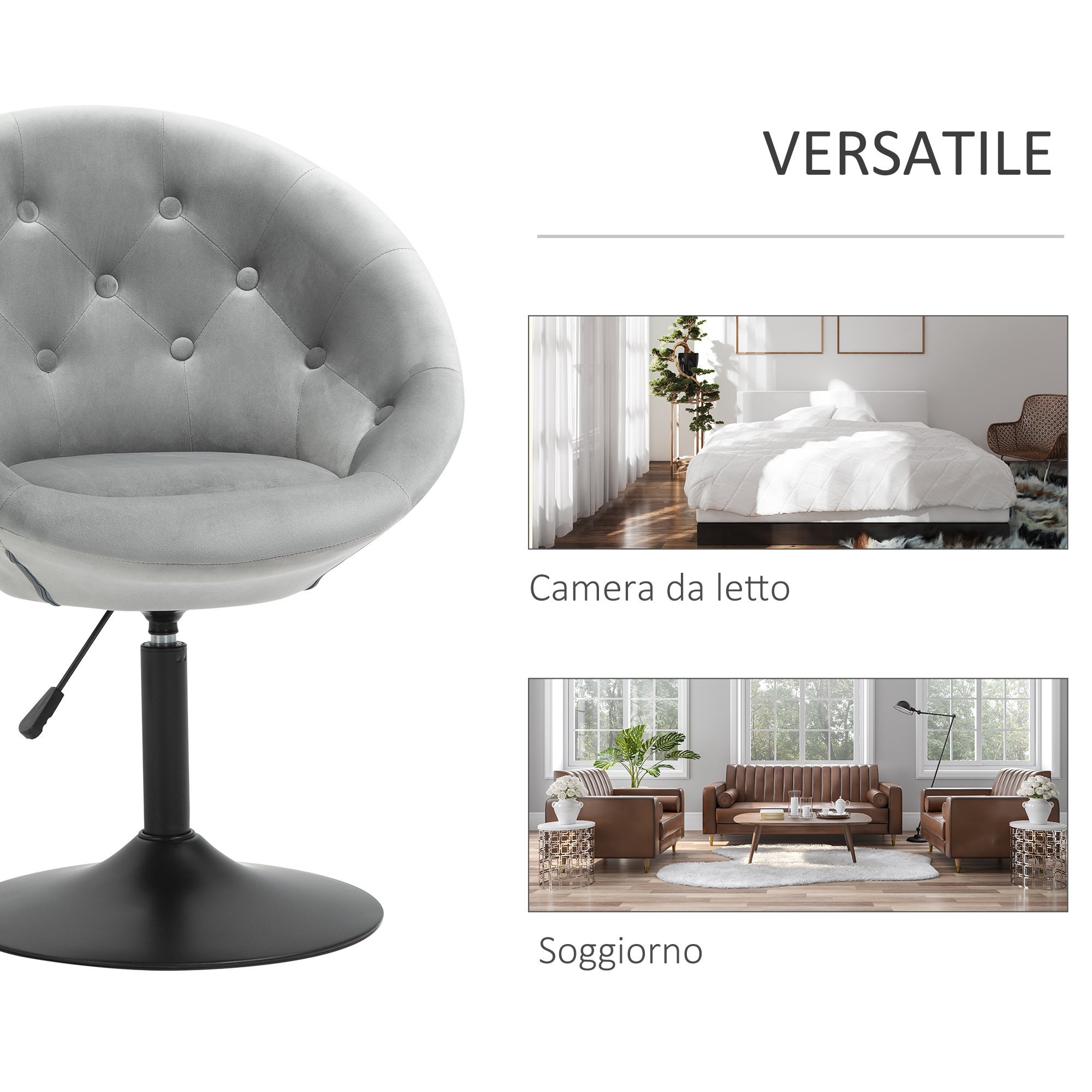 Nujna oprema za kuhinjo, bar in dnevno soboNastavljiva višina po vaših potrebah in vrtljiv sedež Elegantno oblazinjenje z žametnim učinkom, prešito z gumbi. Oblika z ovijanjem, naslonjalom in oblazinjenjem za največje udobje Široka okrogla, težka podlaga, ki ohranja ravnotežje stola, in noge za zaščito tal Potrebna je montaža
