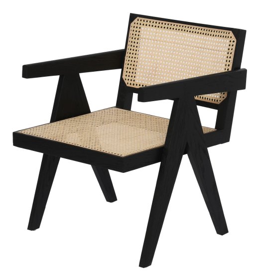 FOTELJ MATISSE DIMENZIJE: 57X71X72CM BARVA: ČRNA, NAURALNA LESENA KONSTRUKCIJA HRAST OGLENO SIVA, SEDEŽ IN NASLONJALO FRANCOSKI PLETENI RATAN NARAVNI Celoten opis