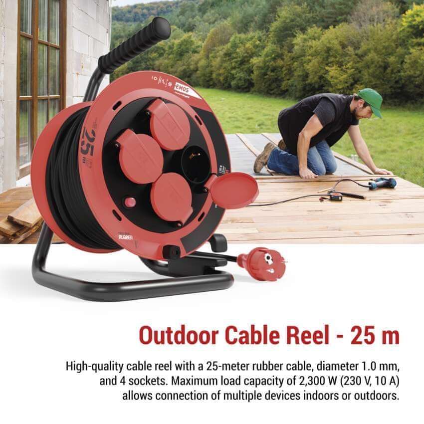 Emos Zunanji kolutni podaljšek 25 m / 4 vtičnice / črni / guma / 230V/400V / 1,0 mm2