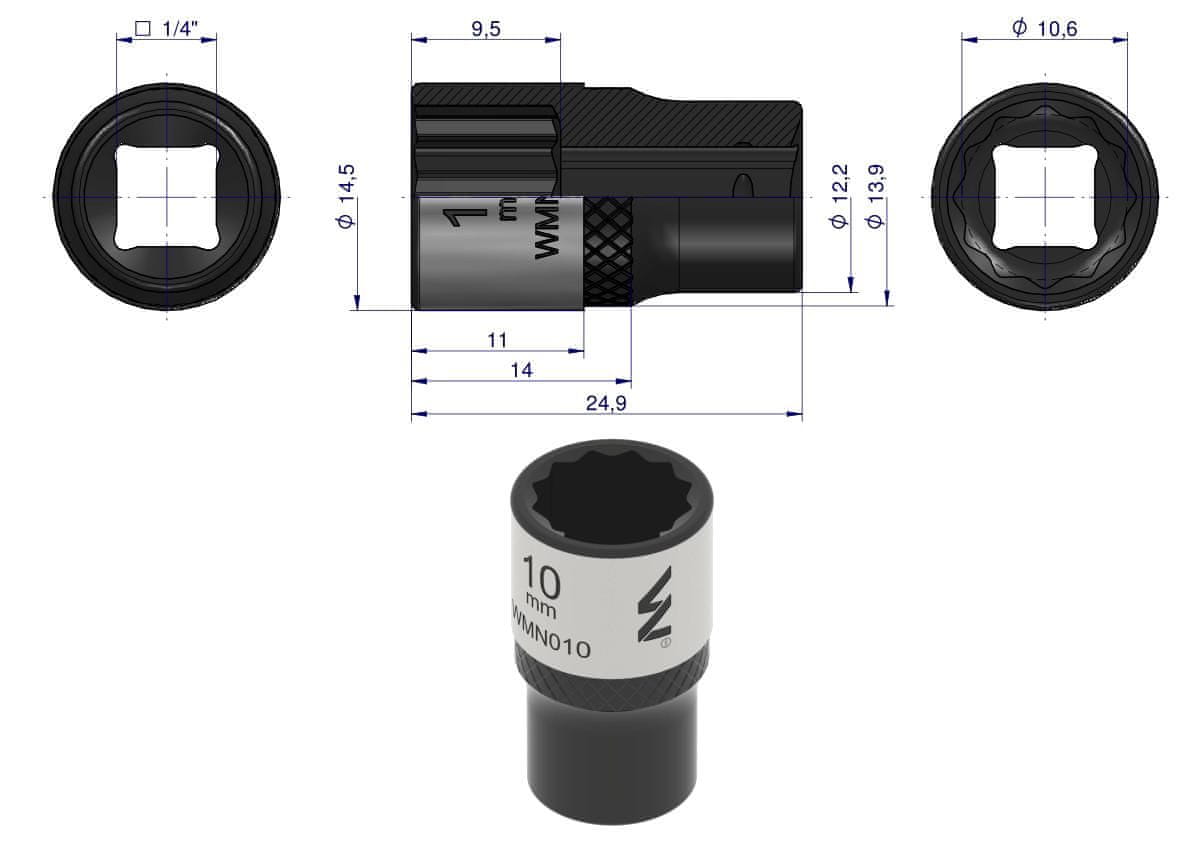 1/4" dvanajsttočkovni ključ. 10 mm. CrV50BV30. DIN 3124. Waryński