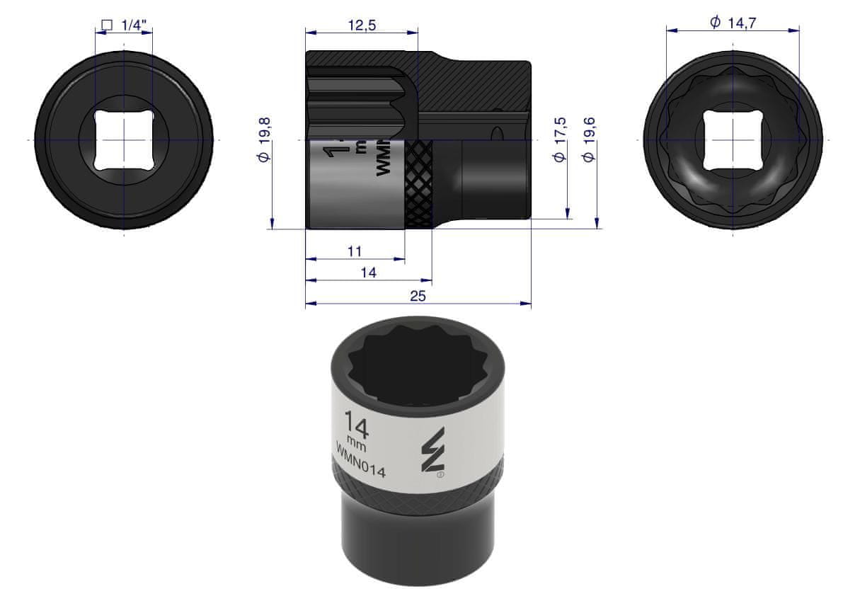 1/4" dvanajsttočkovni ključ. 14 mm. CrV50BV30. DIN 3124. Waryński