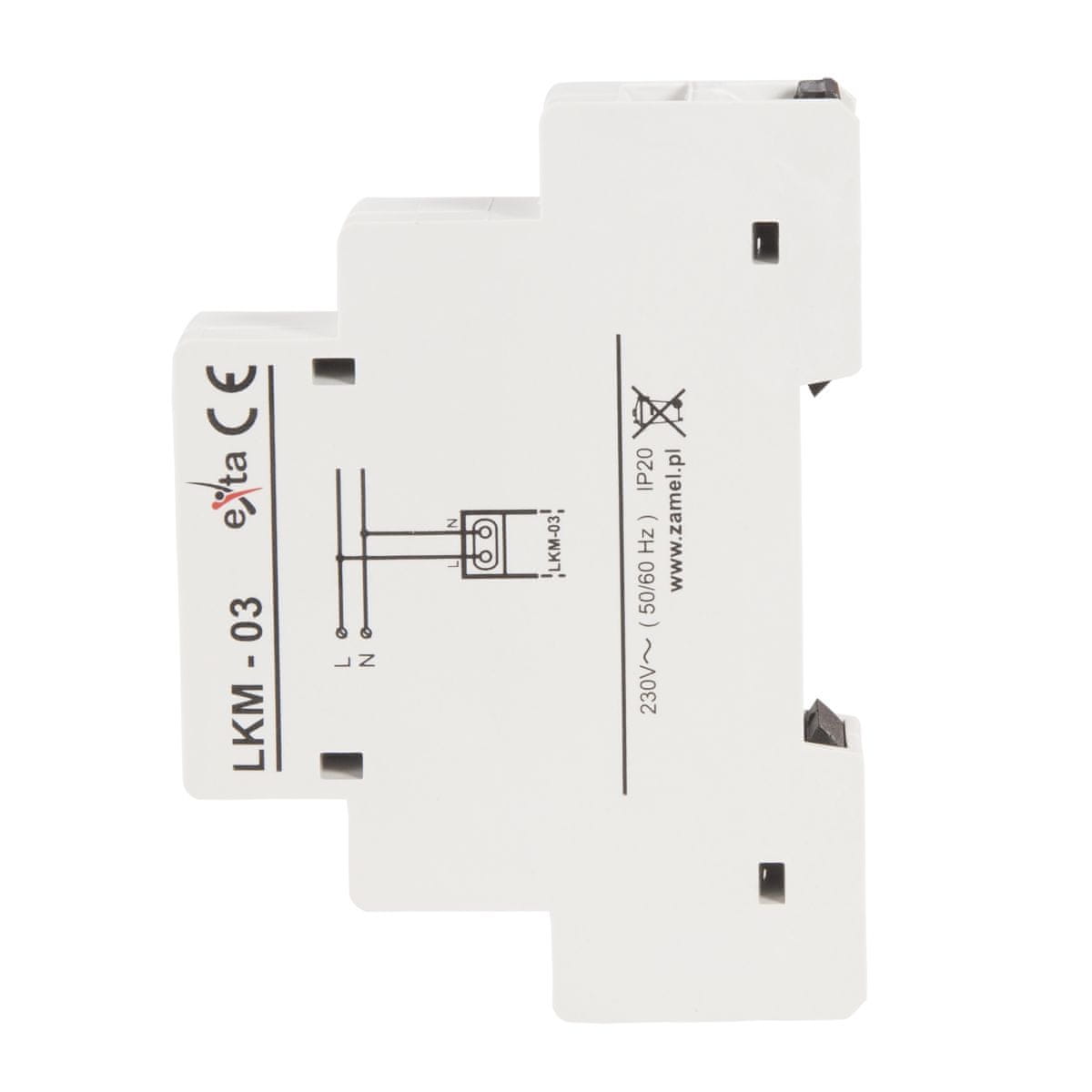 Dimenzije posameznega modula 90×17,5×66 mm Teža 0,062 kg TEHNIČNI PODATKI (LKM-03–30) Nazivna napajalna napetost 230 V AC Nazivna poraba toka 15 mA Razred zaščite ohišja IP20 Montaža ohišja na tirnico TH35 (PN-EN 60715)