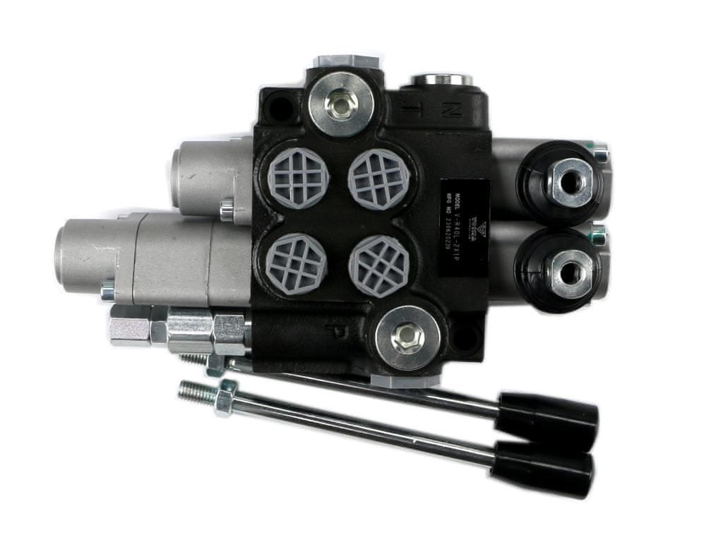 VOIMA 2-delčni hidravlični razdelilnik 40L (1-delčni plavajoči) – Monoblok z vzporedno razporeditvijo in nevtralnim središčnim položajem. V nevtralnem položaju olje kroži med hidravlično črpalko in rezervoarjem. En del: plavajoči (z zapahom).