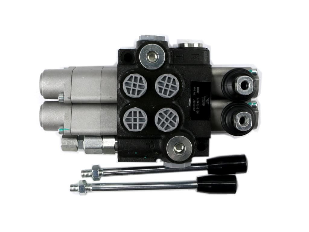 VOIMA 2-delčni hidravlični razdelilnik 40L (2 odseka – plavajoči) – monoblok z vzporedno razporeditvijo z nevtralnim središčnim položajem. V nevtralnem položaju olje kroži med hidravlično črpalko in rezervoarjem. Plavajoči deli (z zapahom).