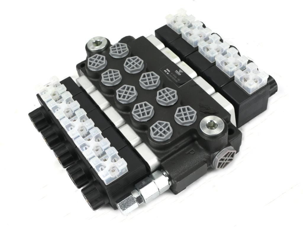VOIMA 5-delni električno krmiljeni hidravlični razdelilnik 12V 40L – monoblok z vzporednim sistemom in srednjim nevtralnim položajem. V nevtralnem položaju olje kroži med hidravlično črpalko in rezervoarjem.