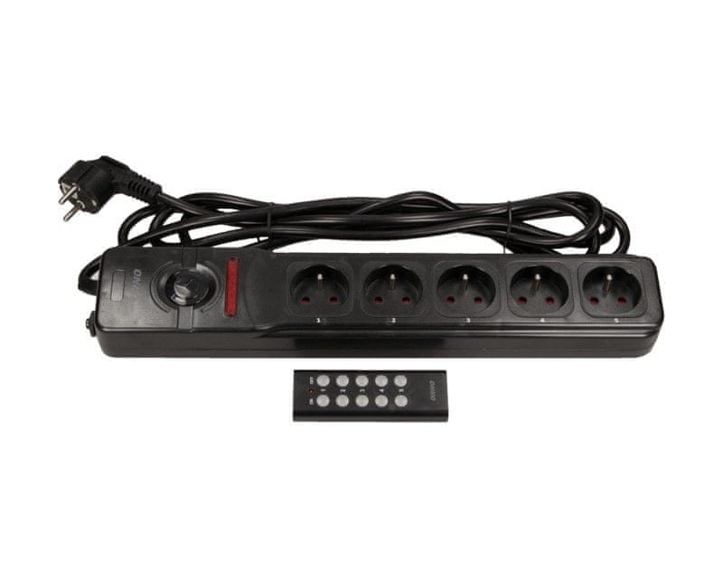 Radiostyrd förlängningssladd med fjärrkontroll, utformad för att trådlöst och oberoende slå på och av upp till fem anslutna elektriska apparater. Den har fem nätuttag med jordning och strömavstängning, halvautomatiskt överbelastningsskydd och en 3 m kabel.