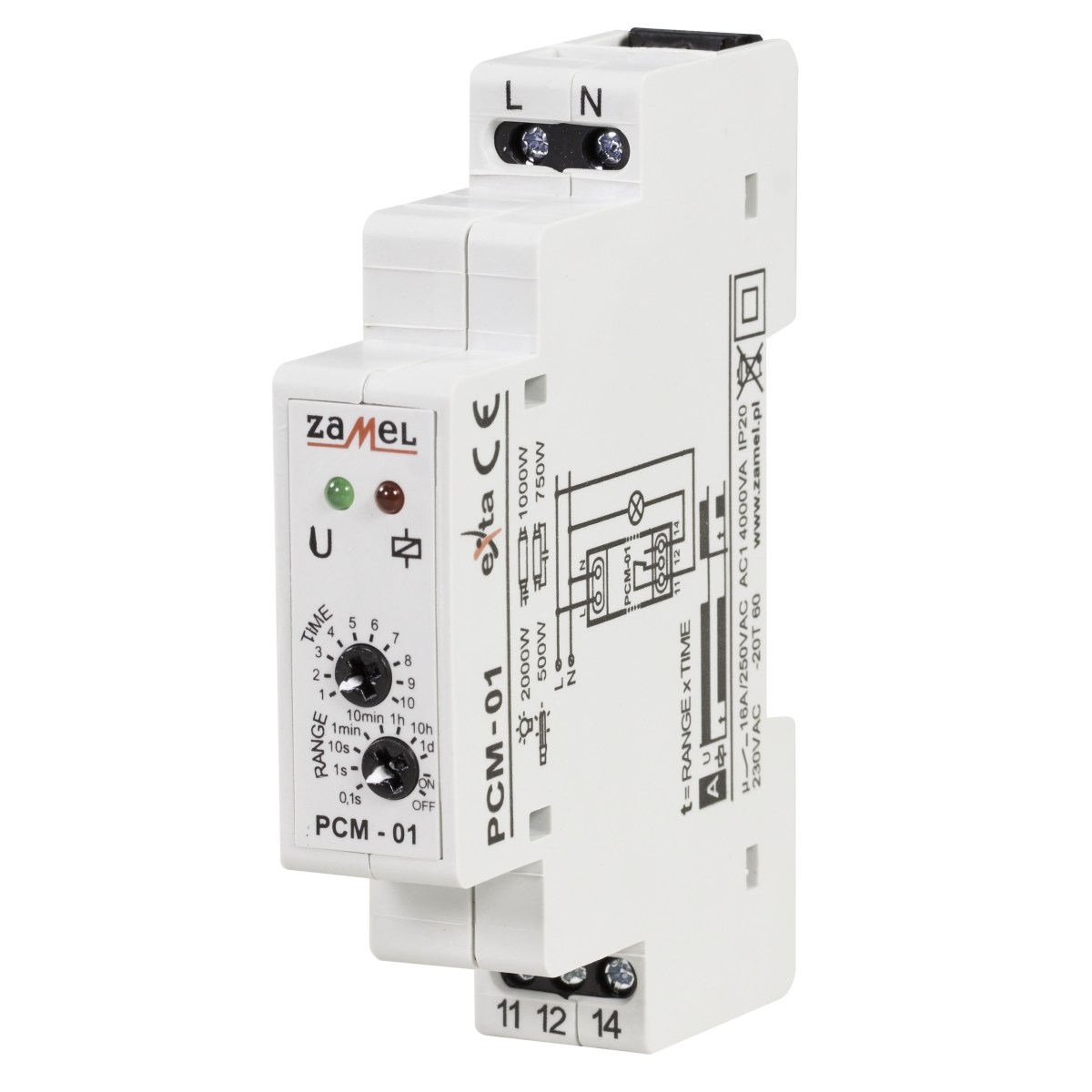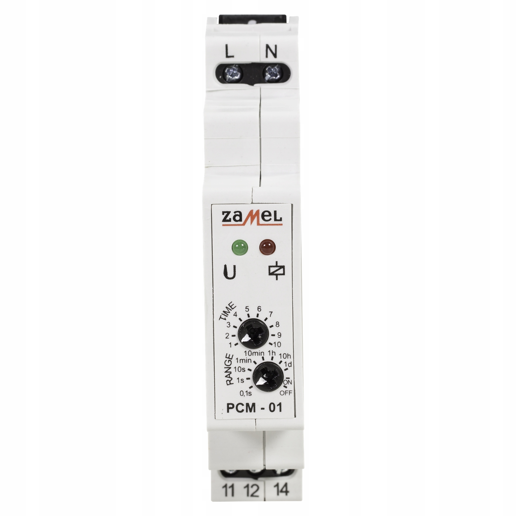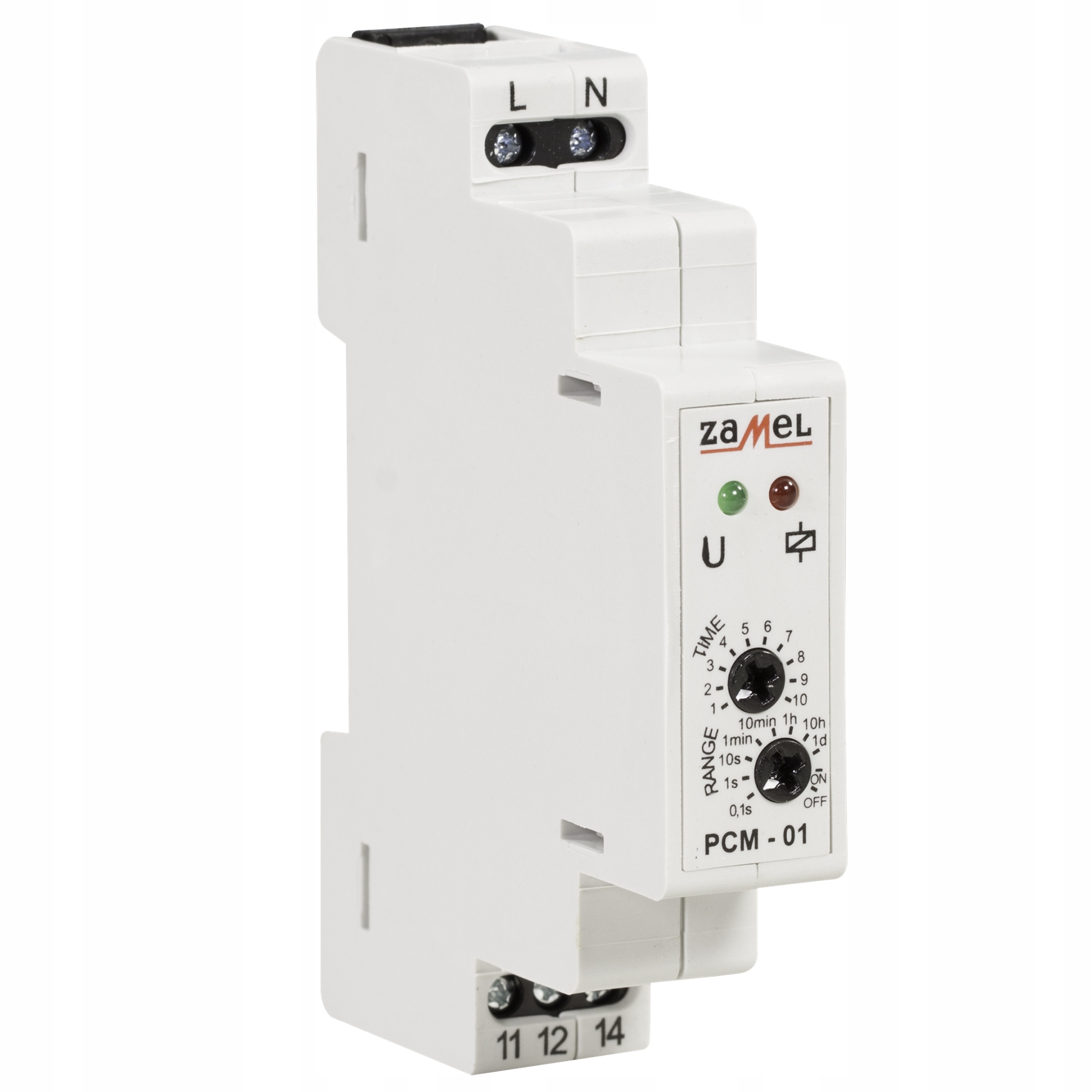 Enofunkcijski časovni rele PCM-01 se uporablja za izvedbo funkcije zakasnjenega vklopa (vzvratno) v sistemih avtomatizacije in krmiljenja. Rele se sproži z napajalno napetostjo. Ima zelo širok razpon nastavitve časa od 0,1 sekunde do 10 dni. Dodatne funkcije ON/OFF omogočajo trajni vklop ali izklop bremena. Sistem ima LED indikatorje za napajalno napetost, status releja in merjenje časa.
