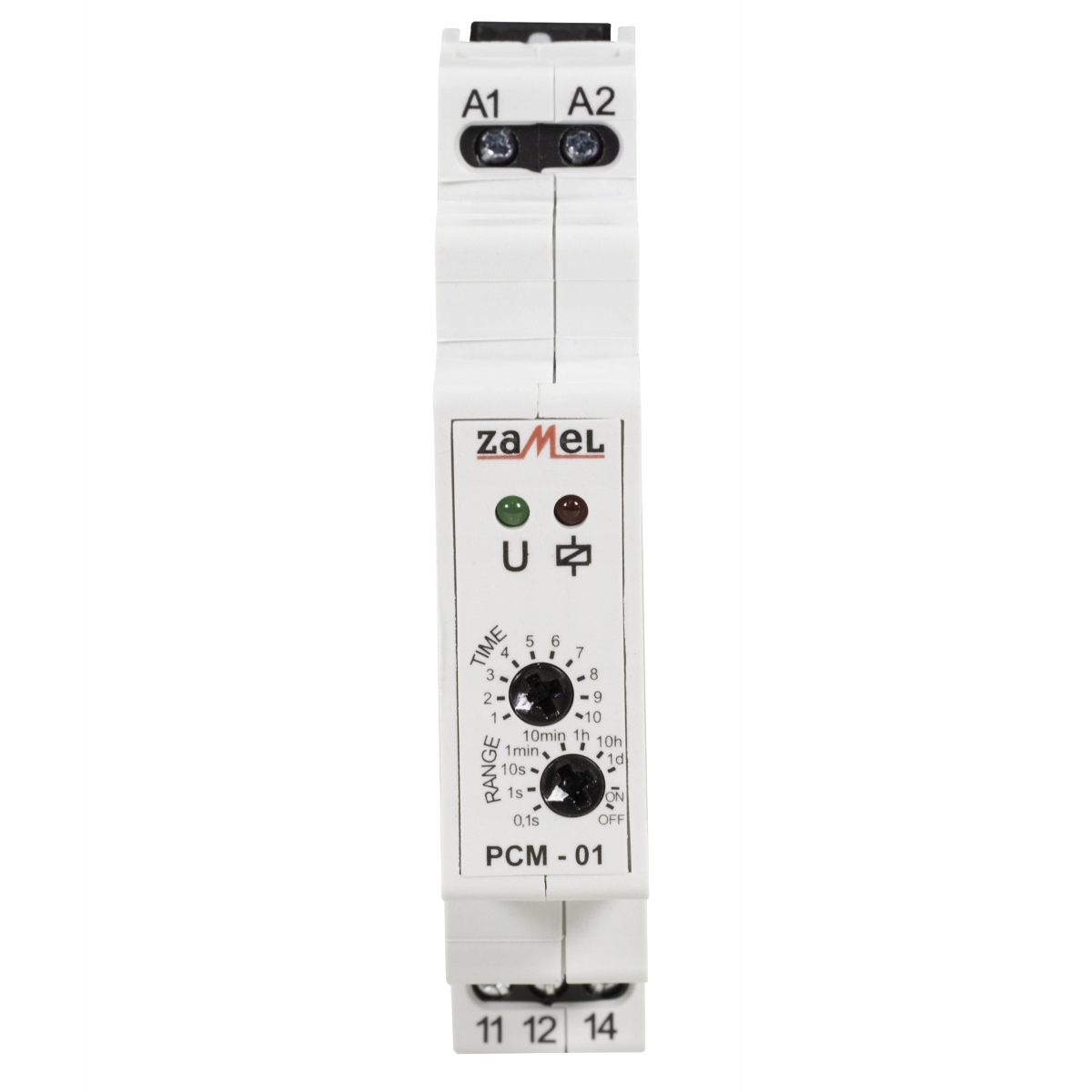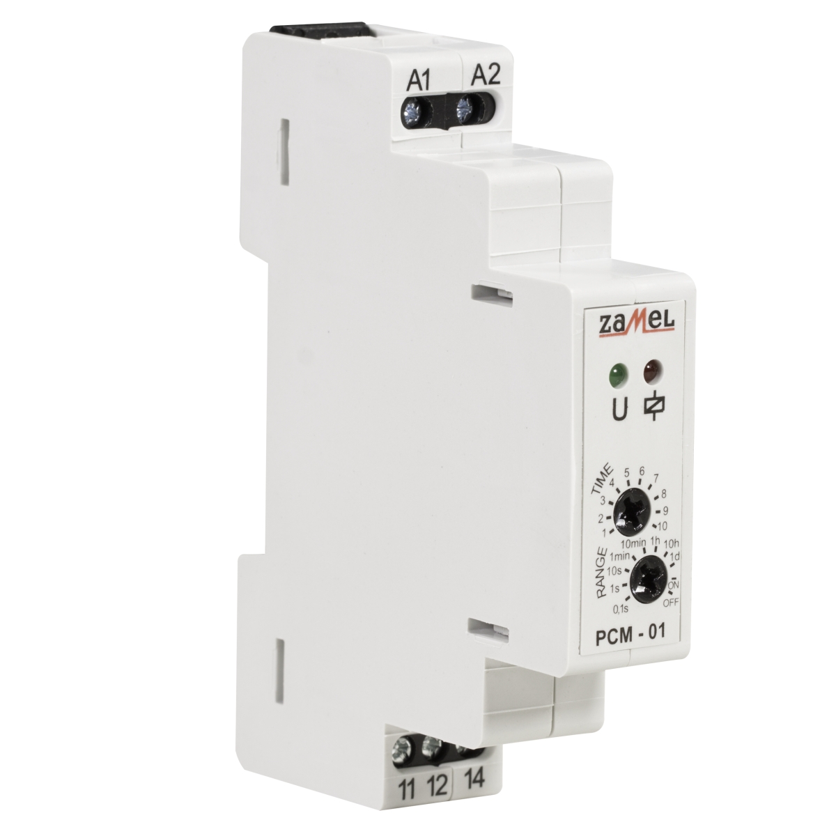 Enofunkcijski časovni rele PCM-01/U se uporablja za izvedbo funkcije zakasnjenega vklopa (vzvratno) v sistemih avtomatizacije in krmiljenja. Rele se sproži z napajalno napetostjo. Ima zelo širok razpon nastavitve časa od 0,1 sekunde do 10 dni. Dodatne funkcije ON/OFF omogočajo trajni vklop ali izklop bremena. Sistem vsebuje LED indikatorje za napajalno napetost, status releja in merjenje časa.
