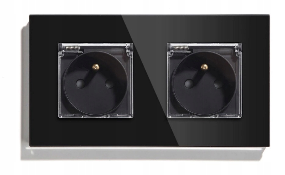 Dvojna, hermetična 16A električna vtičnica v črni barvi znamke BSEED. Sprednja plošča je izdelana iz kaljenega stekla.