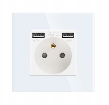 Bela 16A električna vtičnica z dvema 2,1A USB-A vhodoma. Sprednja plošča je izdelana iz kaljenega stekla.