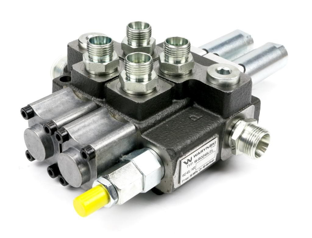 Set: Set: 2-delčni hidravlični razdelilnik za kable + Waryński povezovalni elementi Set vključuje: 1. W-ROZ40L/2L (Dvodelni hidravlični razdelilnik (2) 40L, krmiljen z Waryński joystickom) x 1 kos; 2. W-5011061206 (Hidravlični priključek BB (XGE) M18×1,5 12L x 3/8" BSP ED Waryński) x 4 kosi; 3. W-5011061506 (Hidravlični priključek BB (XGE) M22×1,5 15L x 3/8" BSP ED Waryński) x 1 kos; 4. W-5011061508 (Hidravlični priključek BB (XGE) M22×1,5 15L x 1/2" BSP ED Waryński) x 1 kos