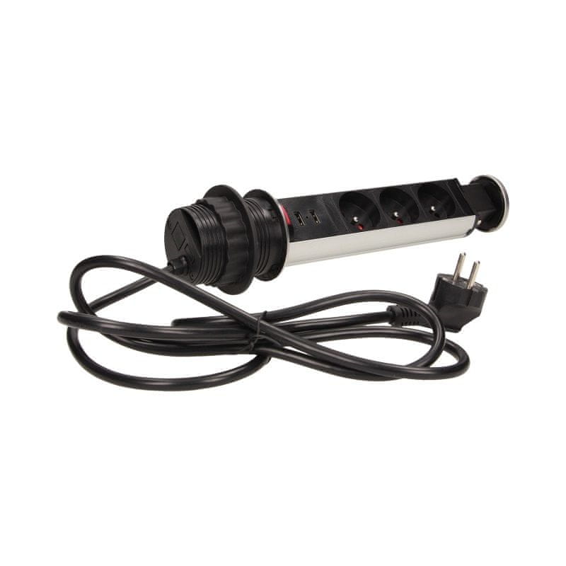 Sats med tre nätuttag med jordning och strömavstängning i ett hölje som dras in i bordsskivan. Enheten är avsedd för installation i konferensbord, kontors- och köksmöbler. Den har en infällbar uttagspanel, ett extra lås och en 1,8 m kabel. Rostfritt stål INOX.
