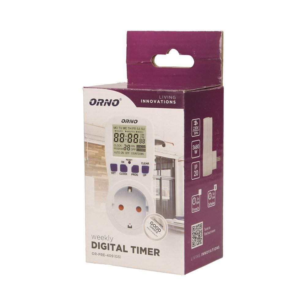 Programator z velikim LCD zaslonom za nastavitev časov vklopa in izklopa električnih naprav, kot so razsvetljava, grelniki vode, oglasi itd. Naprava ima: 16 časovnih programov, ročni ali naključni vklop/izklop, 16 kombinacij dni v tednu, funkcijo poletnega in zimskega časa, funkcijo ODŠTEVANJA.