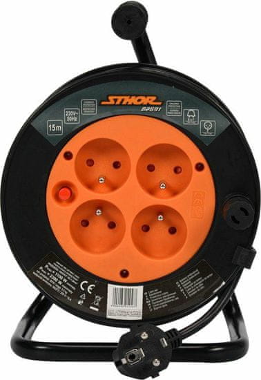 15-metrski kolutni podaljšek STHOR 82691. Podaljšek s 4 vtičnicami z ozemljitvijo omogoča priklop več naprav hkrati. Zahvaljujoč uporabi čepov, odpornih proti prahu in škropljenju, se lahko uporablja v zaprtih prostorih in na prostem, na primer na gradbiščih, na vrtu ali v proizvodnih obratih. Zagotavlja tudi ustrezno zaščito pred vlago. • 3-žilne bakrene žice s presekom 1 mm2 • žice z debelo izolacijo iz naravnega kavčuka H05RR-F, zelo odporne na mehanske poškodbe, vremenske vplive, kemikalije (hladilna in mazalna olja, bencin, etilni in metilni alkoholi) • termično varovalka in otroška zaščita • maks. obremenitev: 1200 (230 V), 3000 (400 V) – zvit kabel, in 3600 (230 V), 9000 (400 V) – nezvit kabel • opremljen s kovinskim okvirjem • ohišje in boben izdelani iz lahkega in trpežnega materiala • ergonomski ročaj omogoča enostavno in udobno prenašanje ter hitro navijanje kabla • skladen s standardom IP44.