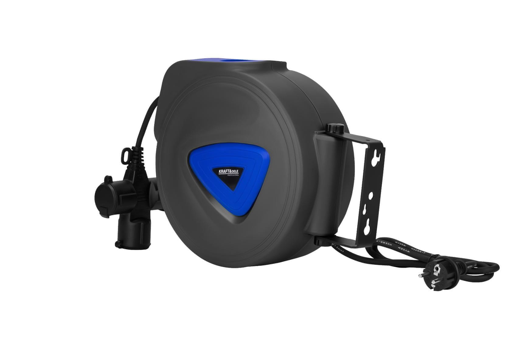 Avtomatski izvlečni podaljšek, model KD4045, avtorKraft&Deleje popoln pripomoček za vsak dom, delavnico in vrt. Trdno plastično ohišje ščiti kabel in ščiti pred pregrevanjem, za varnost pa poskrbi vtičnica, varna za otroke. Montaža na steno. Uporablja se za povezovanje žic, kablov, cevi itd.