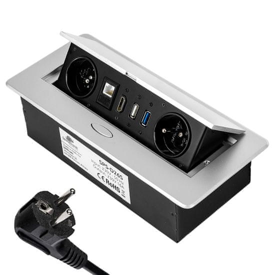Eleganten medijski priključek, nameščen na pult, z odpiranjem s pritiskom na gumb. Z dvema električnima vtičnicama, priključkom HDMI, ethernetom (RJ-45 CAT6), USB 2.0 in USB 3.0. Dolžina kabla 1,5 m. V srebrni barvi Celoten opis
