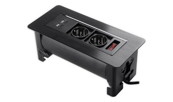 Eleganten vrtljiv medijski priključek, nameščen na pult. Ima 2 električni vtičnici Schuko, stikalo za napajanje in dvojni polnilnik USB. Dolžina kabla 1,5 m. V črni barvi