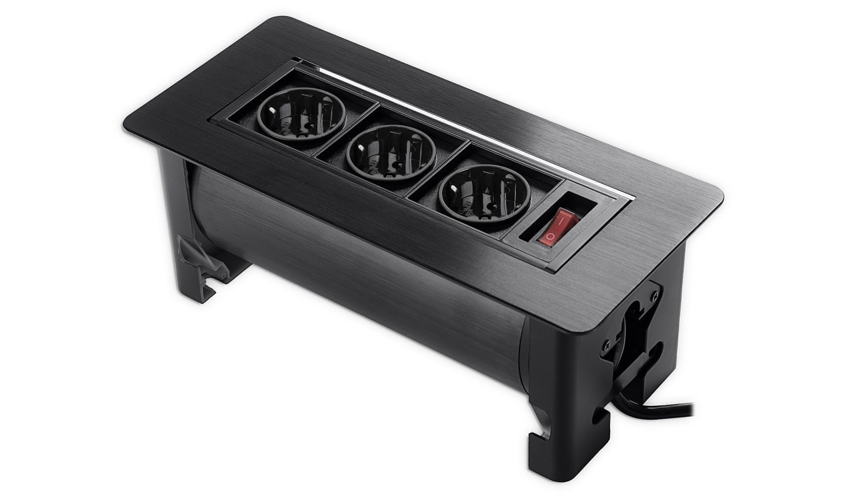 Vrtljiva vtičnica za pohištvo na pultu. Ima 3 električne vtičnice Schuko in stikalo za napajanje. Dolžina kabla 1,5 m. V črni barvi