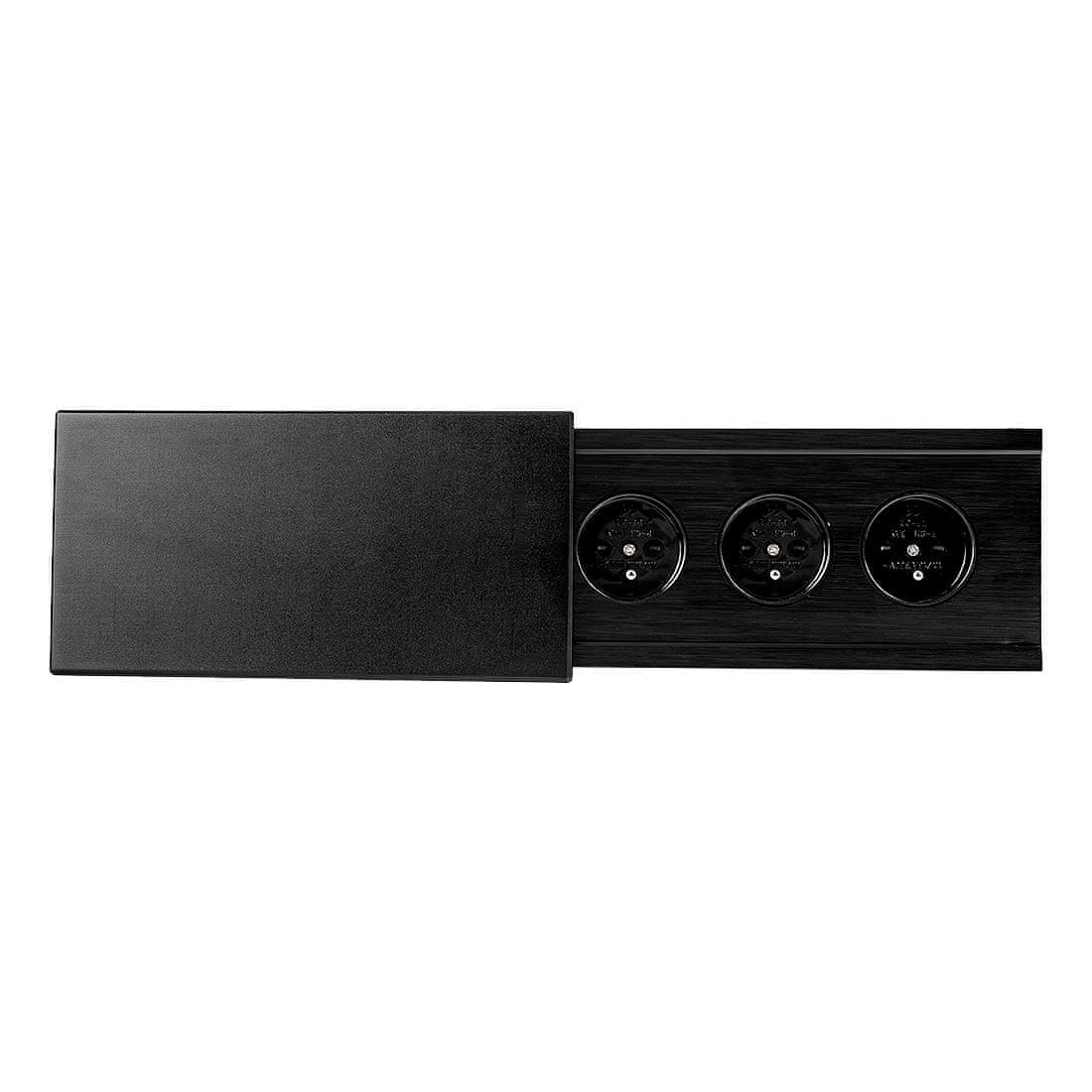 Spacetronik črna vgradna vtičnica za pult v izvedbi COMPACT slide-in. Opremljena s tremi vtičnicami francoskega tipa. Dolžina kabla 1,5 m.