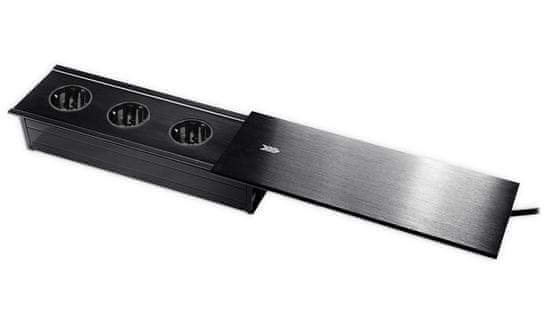 Eleganten drsni medijski priključek, nameščen na pult. Ima 3 električne vtičnice (Schuko). Dolžina kabla 1,5 m. V črni barvi.
