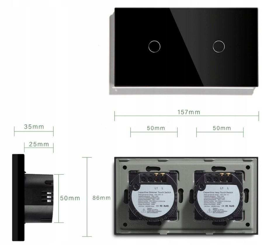 STIKALO ZA ZATEMNItev LUČI NA DOTIK DVOJNO STEKLO 157mm Stikalo za luči na dotik s funkcijo zatemnitve dvojno 157mm za dvojno električno omarico iz kaljenega stekla in visokokakovostnih komponent. Ponujeno stikalo za luči je preprosta in elegantna naprava. Sprednja plošča je izdelana iz kaljenega stekla debeline 4 mm. To so visokokakovostni materiali, zaradi katerih je stikalo zelo trpežno in elegantno. Prvič, odporen je na praske in razbarvanje ter vodoodporen, zato ga ne motijo mokri prsti in je enostaven za čiščenje. Poleg tega je ognjevarna, kar povečuje varnost. Gumbi na sprednji plošči nežno svetijo v modri barvi, kar olajša iskanje stikala v temi. LED lučka gumba sveti ves čas. Ko je lučka prižgana, sveti močneje, ko je lučka ugasnjena, pa sveti nežno, da ne moti na primer med spanjem. Visokokakovosten izdelek priznanega podjetja BSEED. Sprednja plošča je v celoti bela. Kovinski okvir povezuje vse elemente v celoto, kar potrjuje kakovost uporabljenih komponent pri izdelavi stikala. Pri namestitvah z zatemnitvijo je treba uporabiti zatemnitvene žarnice. Zatemnilnik lahko deluje z žarnico z žarilno nitko, halogensko sijalko, jodno volframovo sijalko, uporovno LED sijalko, brezstopenjsko zatemnjeno LED sijalko. NE DELUJE Z OBIČAJNO LED RAZSVETLICO ALI ENERGIJSKO VARČNO RAZSVETLICO ALI LED TRAKOVI. Namestitev stikala Upoštevajte vrstni red namestitve, da preprečite težave z dotikom stikala. 1. Odstranite sprednjo ploščo stikala. 2. Povežite ustrezne žice. 3. Privijte okvir stikala na električno omarico. 4. Zamenjajte sprednjo ploščo stikala. 5. Priključite napajalnik. 6. Počakajte približno 2 minuti, med katerima stikalo umeri dotik. Stikalo je pripravljeno za uporabo. Povezava je izvedena kot pri standardnih stikalih. Kot L priključimo trenutni kabel – napajalnik, izhod za kanale (sprejemniki, svetloba, npr. svetilke itd.) pa priključimo na L1 v prvem modulu oziroma L1 v drugem modulu. Specifikacija: Barva – bela Število tipk – 6 (dimmer + dimmer) Standard: EU Napajalna napetost: 100–240V AC Največja obremenitvena moč: 3–300W/na kanal – 500W skupaj Material iz katerega je stikalo izdelano: ABS / kaljeno steklo Dimenzije sprednje plošče: 157mm * 86mm * 9mm Montaža z vijaki na standardno dvojno 60mm električna omarica Naprava ima teste skladnosti: CE, ROHS. V naši ponudbi so različne kombinacije stikal za luči in električnih vtičnic.