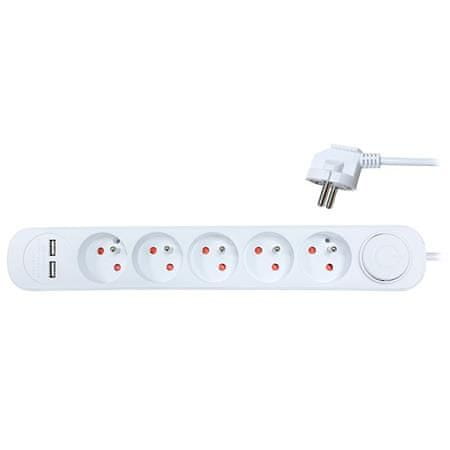 Solight PP152USB podaljšek, 5 vtičnic, USB 2,4A, bela, 3 x 1mm2, stikalo, 3m