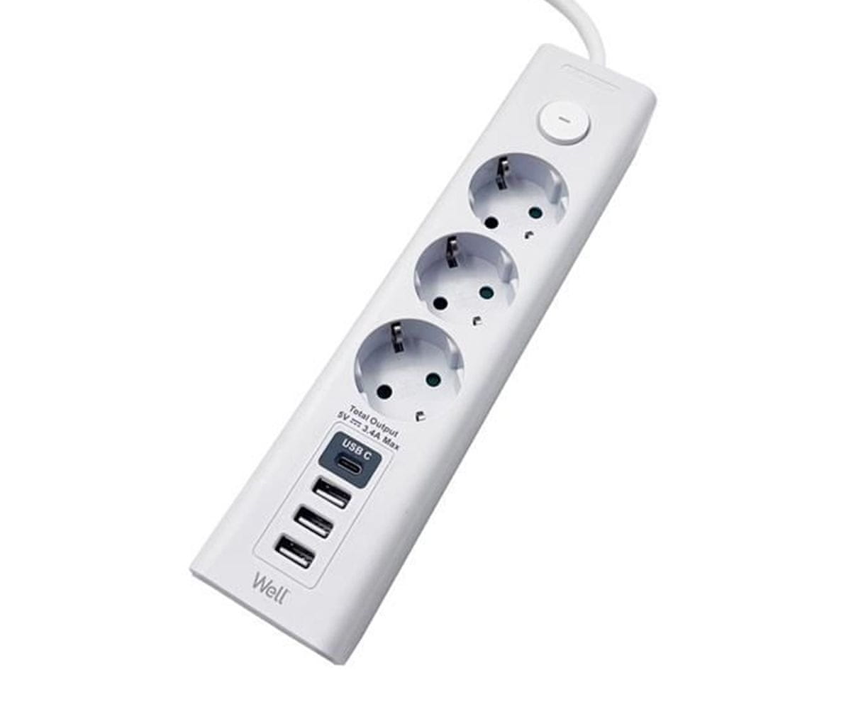 Električni podaljšek POD-WELL-EXTS-3S3M-USBC4 ima na voljo 3 priključke za naprave s priklopom na 250V in 4 priključke za USB napajanje / polnjenje – 1× USB-C in 3× USB-A. Lahko ga uporabljate doma, v pisarni, garaži, poslovnem prostoru – praktično kjerkoli!