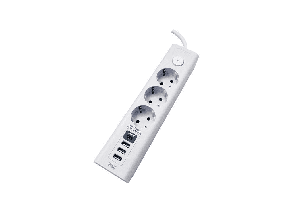 Električni razdelilec/podaljšek z prenaapetostno zaščito dolžine 3m. Ima 3 šuko vtičnice in 4 USB vtičnica za polnjenje telefonov (3×USB-A + 1× USB-C)