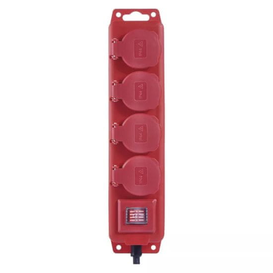 Emos podaljšek se ponaša z dolžino kabla 10 m, 4 vtičnicami zaščitenimi s pokrovi in otroškimi zaslonkami ter stikalom.