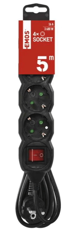 Emos podaljšek, 5 m, 4 vtičnic, s stikalom, PVC, 1,5 mm2, črn (PC1425R)