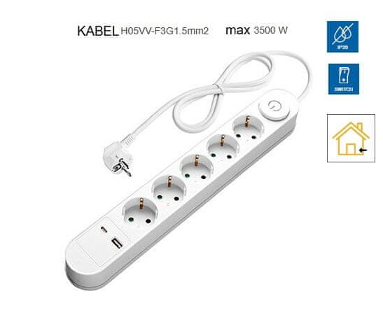 Optonica Podaljšek 5 x vtičnica s stikalom in USB priključkom (A+C)