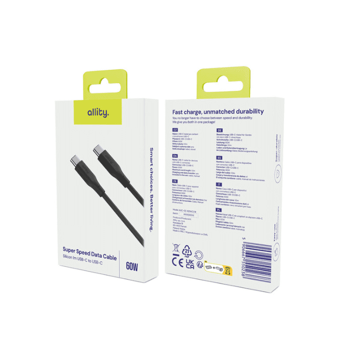 Kabel Allity je sinonim za vzdržljivost. Izdelan je iz visokokakovostnega silikona, ki zagotavlja neprimerljivo odpornost proti mehanskim poškodbam. Silikon ščiti kabel pred odrgninami in pregibanjem, kar znatno podaljša njegovo življenjsko dobo. Poleg tega kakovostni konektorji ščitijo najbolj občutljiva področja.