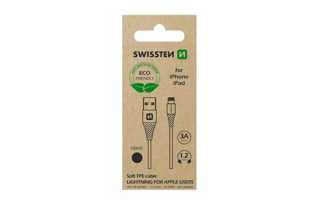 TPE podatkovni kabel Swissten USB/Lightning dolžine 1,2 m. Kabel je ojačan in lahko prenaša večji tok (do 3 A). Ekološko pakiran izdelek je brez nepotrebnih plastičnih lističev. Okolju prijazna embalaža, ki pomaga zmanjšati ekološko breme izdelka. Škatla je izdelana iz recikliranega papirja, ki ga je mogoče enostavno reciklirati. Oblikovanje tudi čim bolj natančno povzema velikost izdelka.